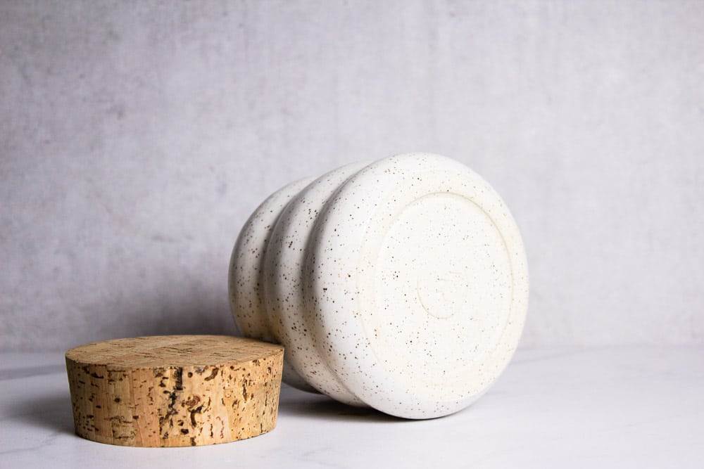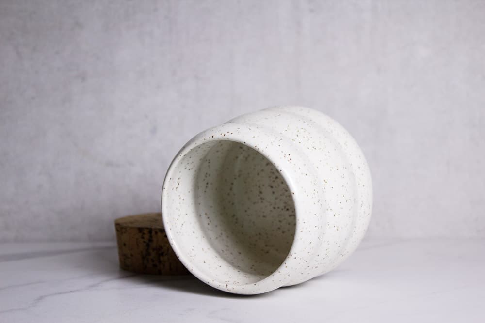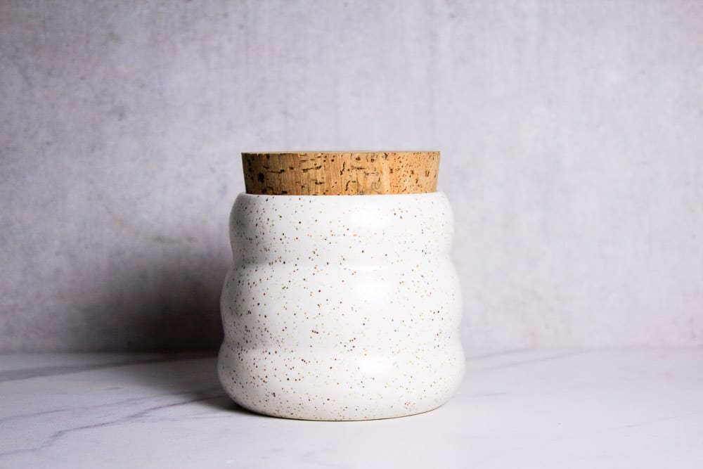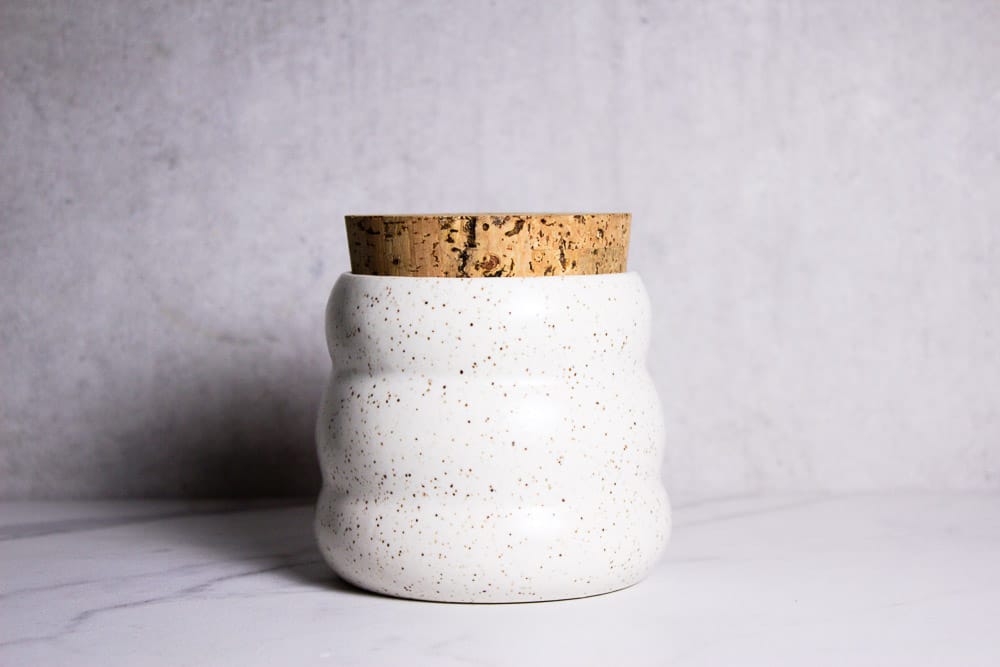 Wavy jar corked jar in white speckled clay.